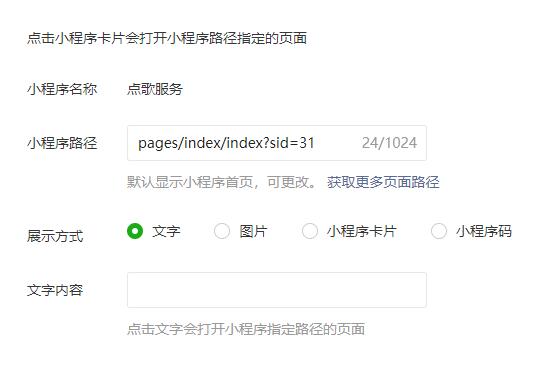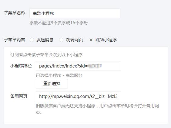 设置需要跳转小程序的菜单,点击“跳转小程序”→“选择小程序”,名称输入“点歌服务”,小程序路径输入:
